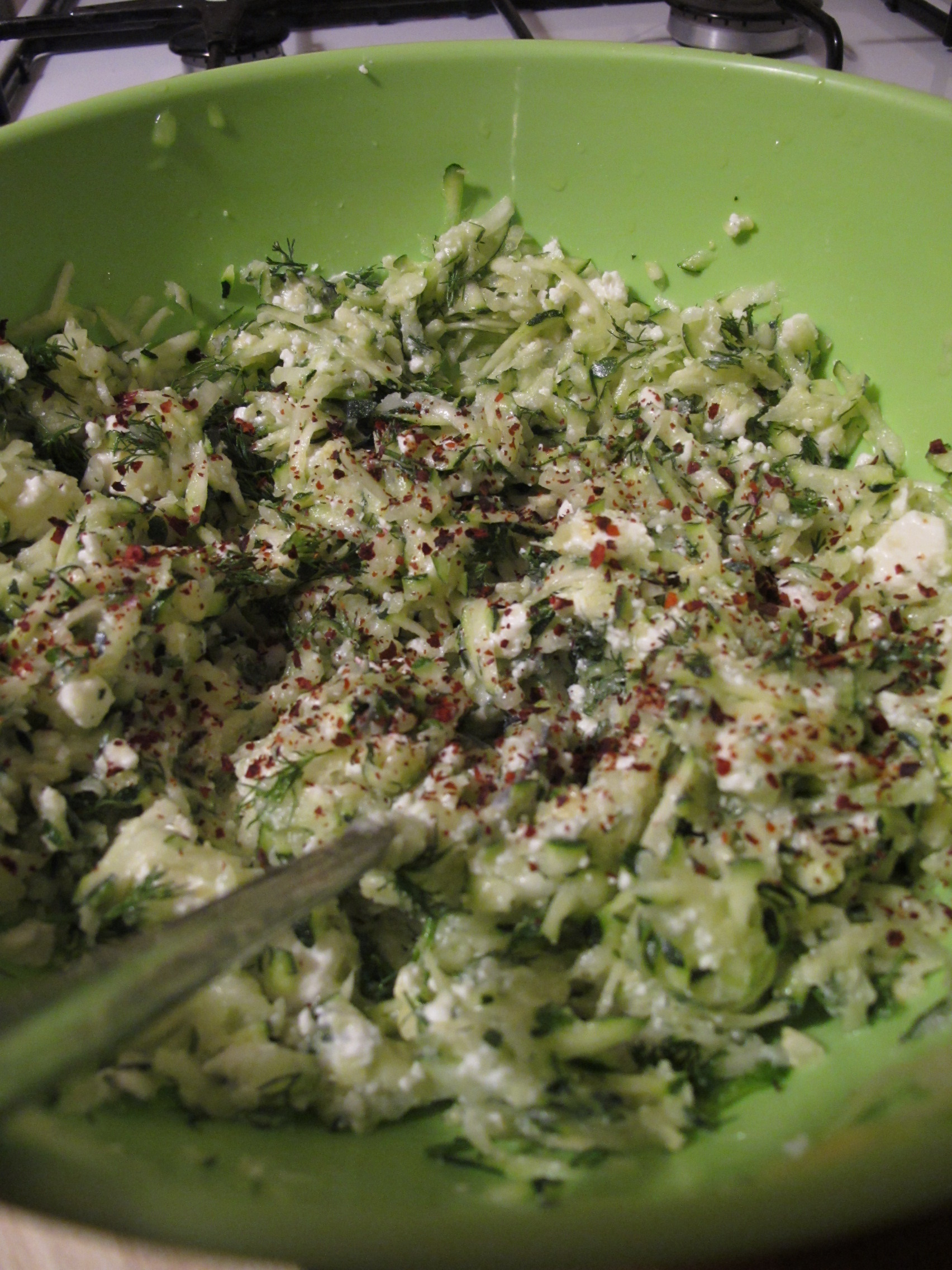 Yıkadığınız kabakların baş kısımlarını çıkartıp rendeleyin. Kabaklı iç hazırladığım böreklerde, her zaman kullandığımız açık renkli sakız kabağı yerine dışı koyu renkli bizim oralarda “Yayla” kabağı olarak bilinen top kabakları tercih ediyorum- özellikle hamurun içinden gözüken koyu yeşiller iştah açabiliyor.