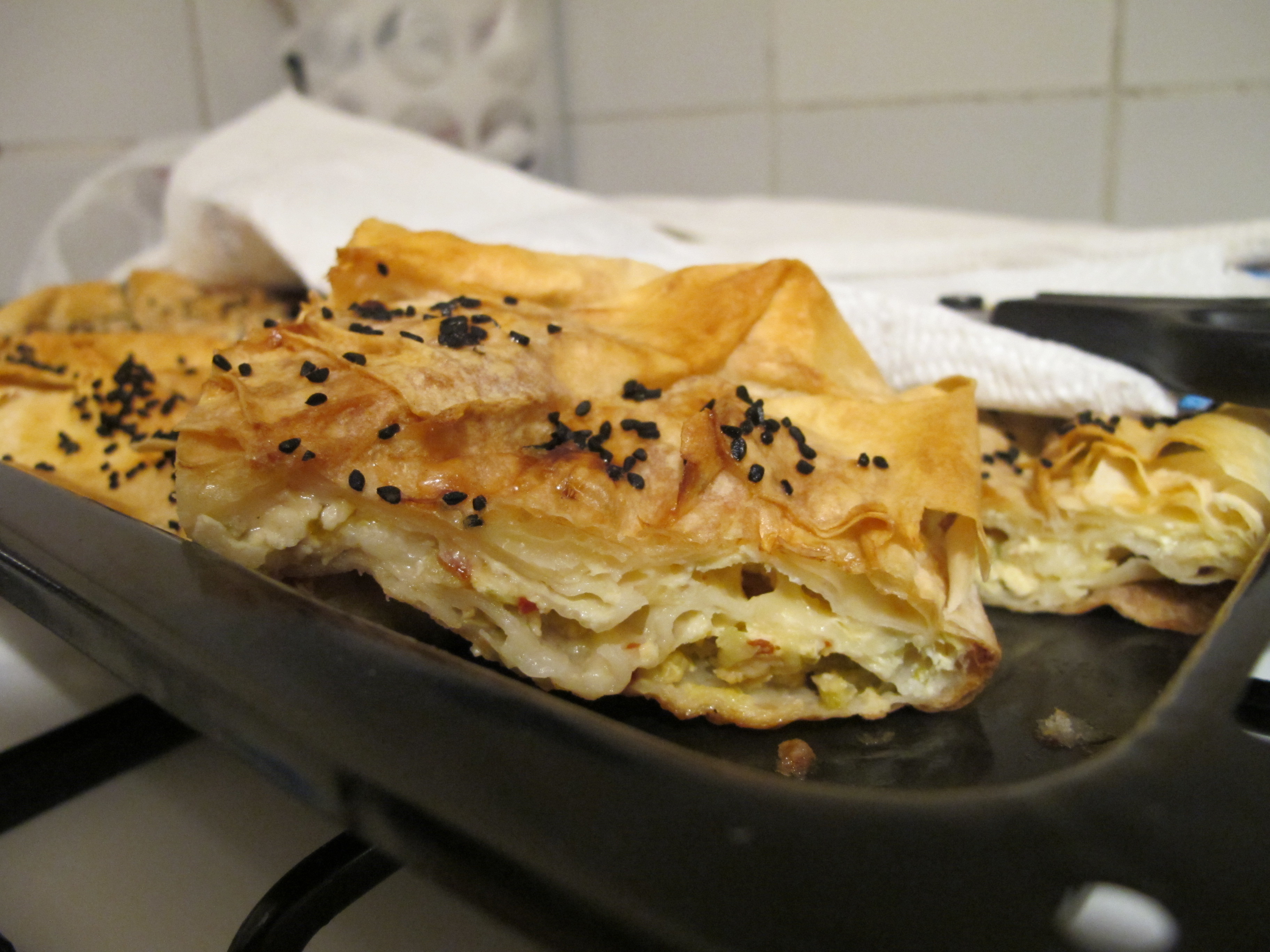 psiye koyduktan sonra sarkan parçaları da tepsinin üzerine alın. Üzerine kalan ara harcı dökün ve çörek otunu serpin. Böreği fırına koymadan önce kesmiş olursanız hem ara harç içine işlemiş olur, hem de börek piştikten sonra kesmenizi kolaylaştırır.