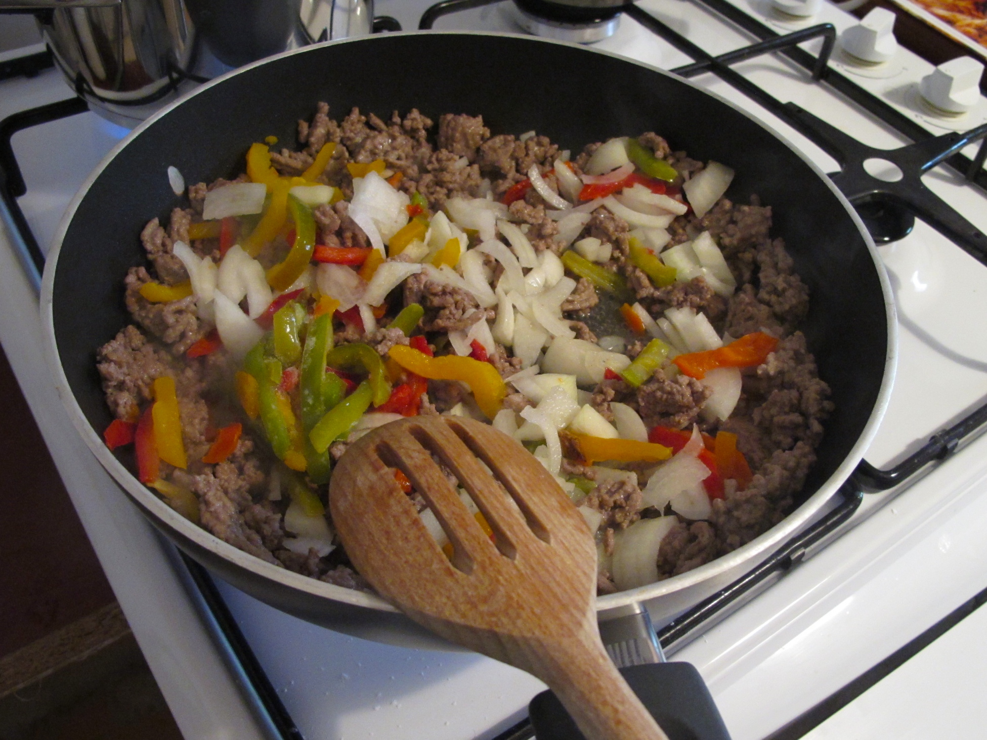 Kıyma renk değiştirdikten sonra soğan ve renkli biberleri ekleyin (son dönemde doğranmış ve dondurulmuş renkli biber kullanıyorum). Börek içinde farklı renkleri görmekten hoşlanıyorum diye her fırsatı değerlendirmiş oluyorum.