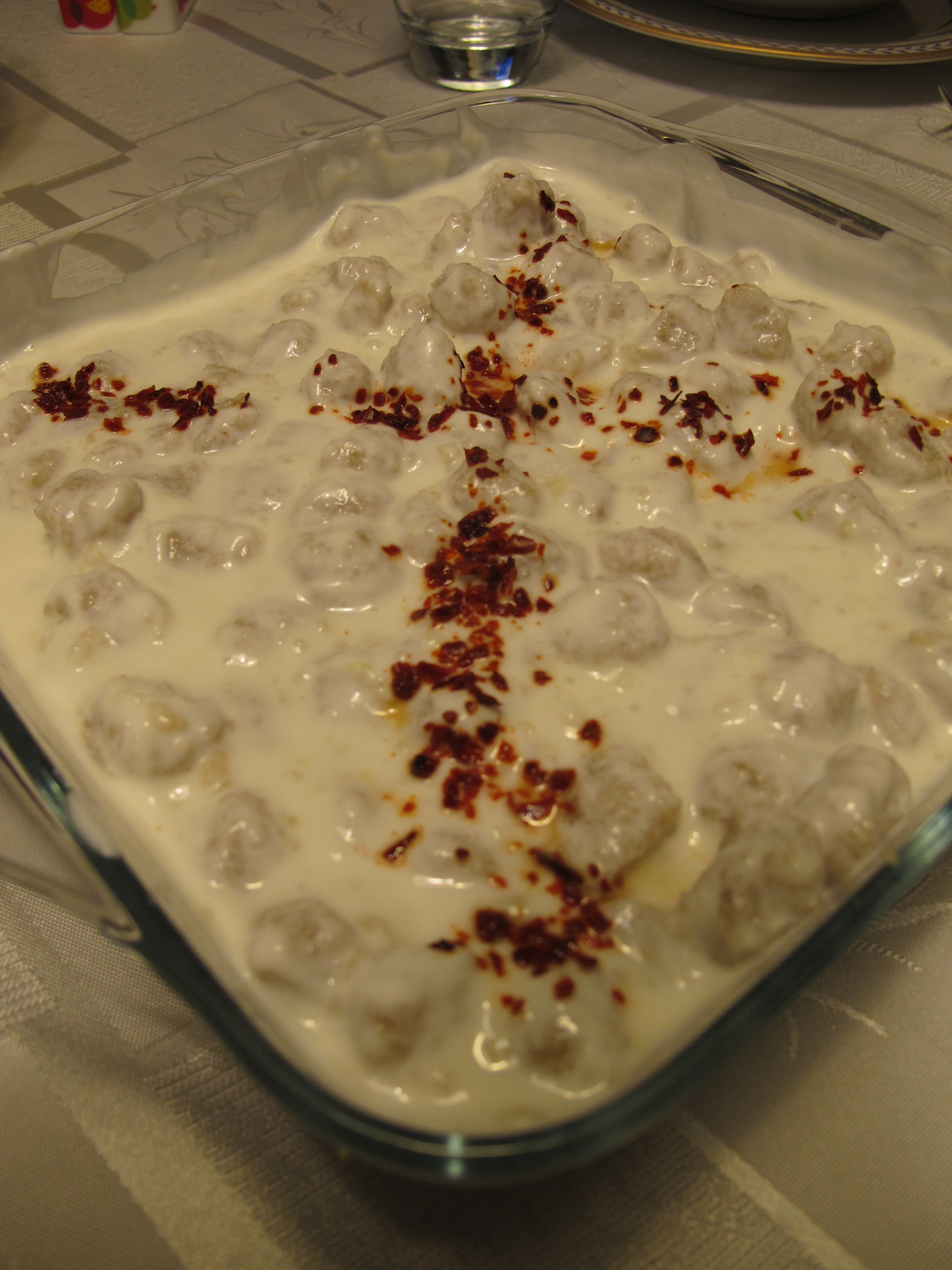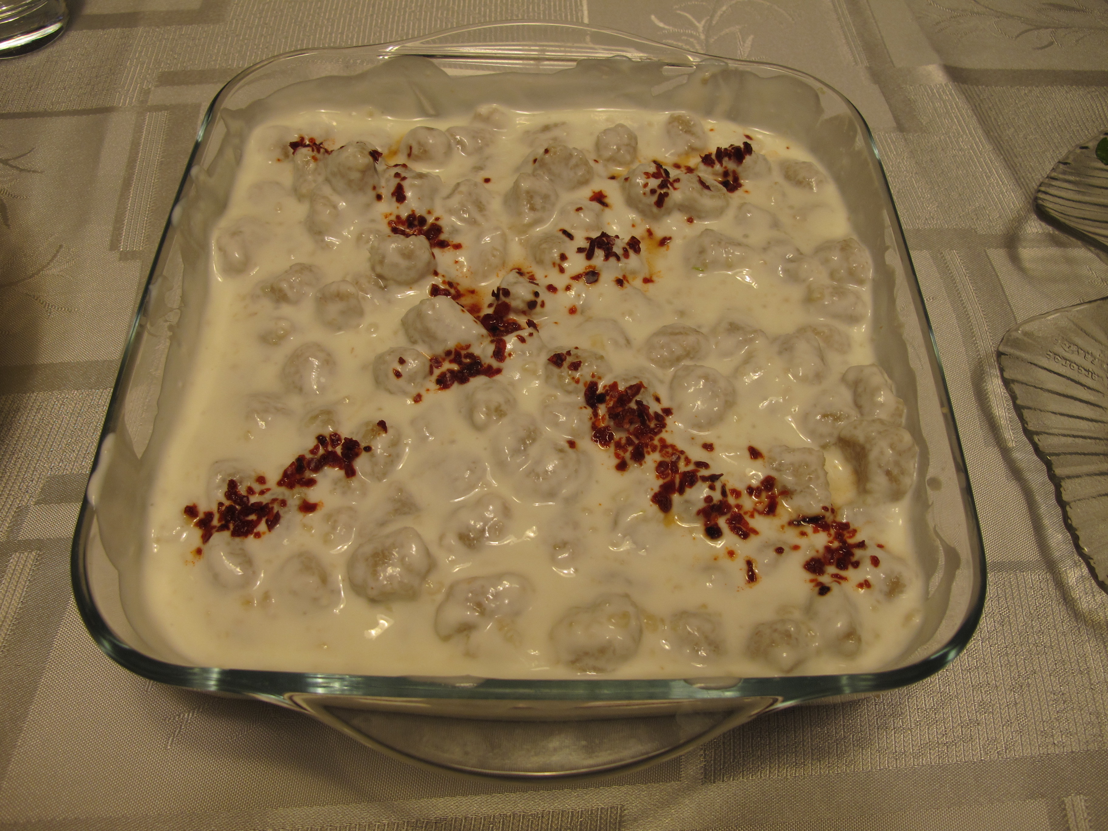 Haşlanan köfteleri metal bir süzgece alıp soğuk su geçirin ve servis kabına alın. Hazırlamış olduğunuz sarımsaklı yoğurdu köftelerin üzerine dökün….