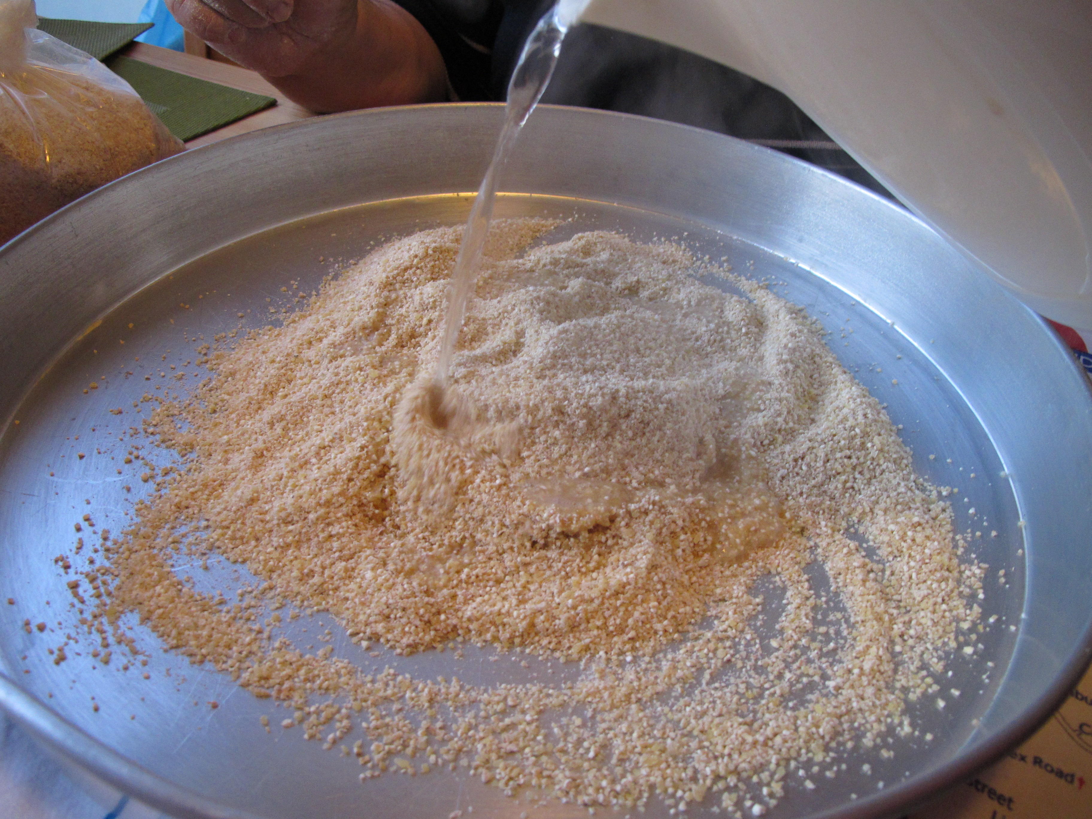 Tepsi içine dökülen yarma, sıcak su (tercihen biraz ılınmış olan su) ile ıslatılır. biraz da soğuk su eklenir.