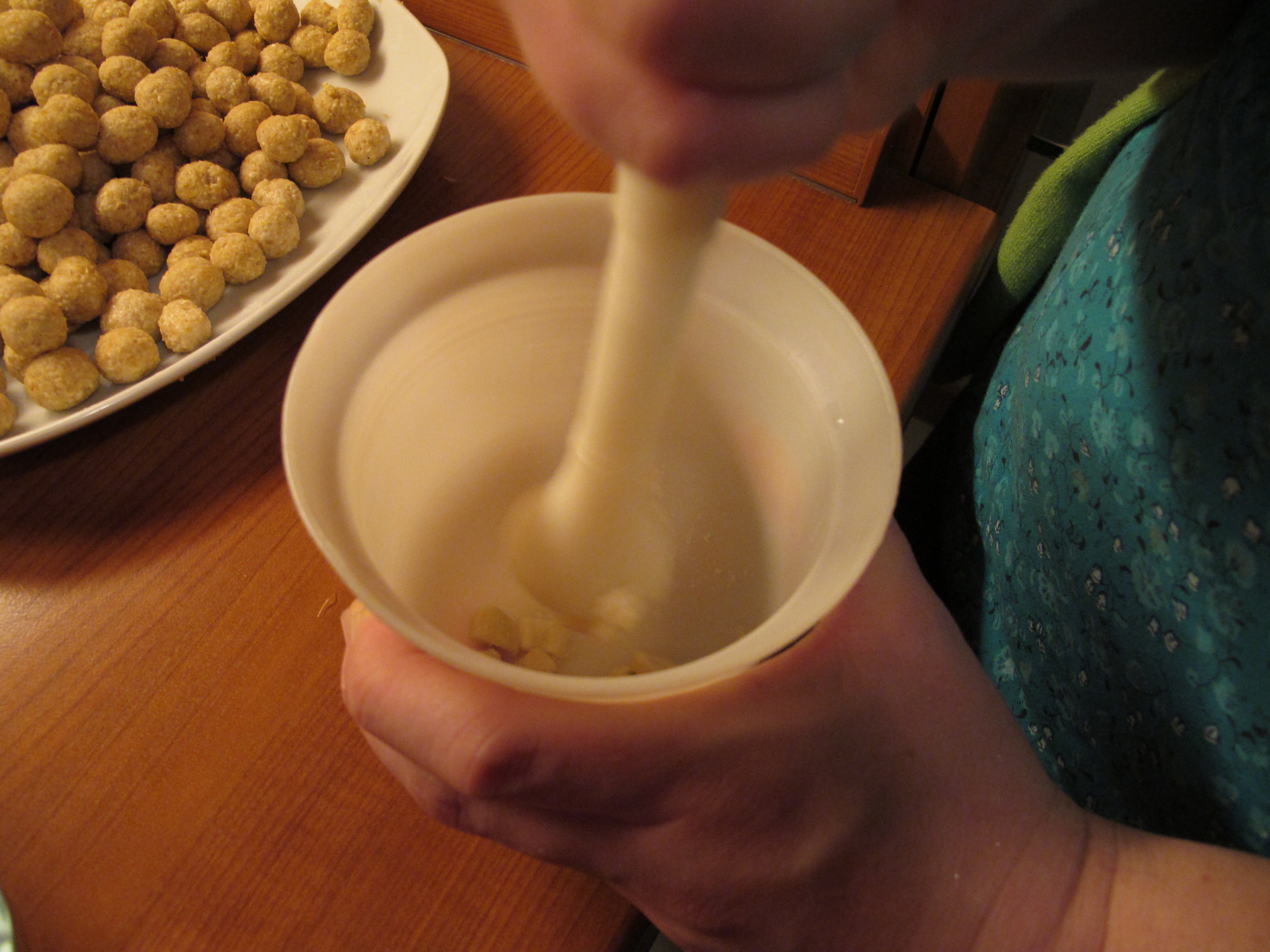 Küçük parçalara bölünmüş olan hamur işaret parmak ile orta parmak arasına alınarak sıkılır. Eğer istenilen şekil elde edilememişse başparmak yardımıyla hamur olduğu yerde çevrilir ve bir daha sıkılır.