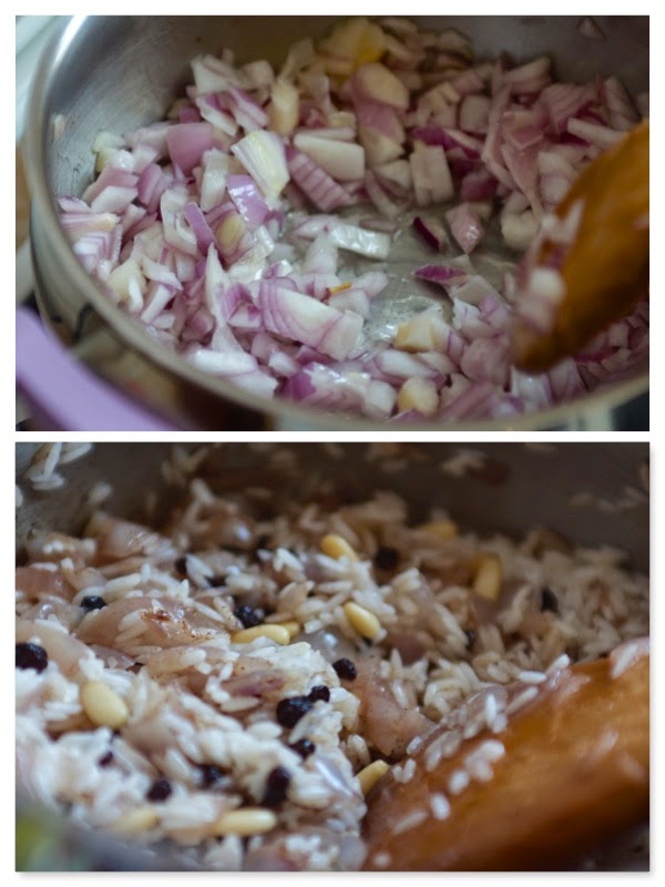 Yumuşamaya başlayan soğanlara, çam fıstığı ve (suyunu süzdüğünüz) kuş üzümlerini ekleyerek, kavurma işlemine devam edin. sonrasında baharatları ve tuzu ilave edin.