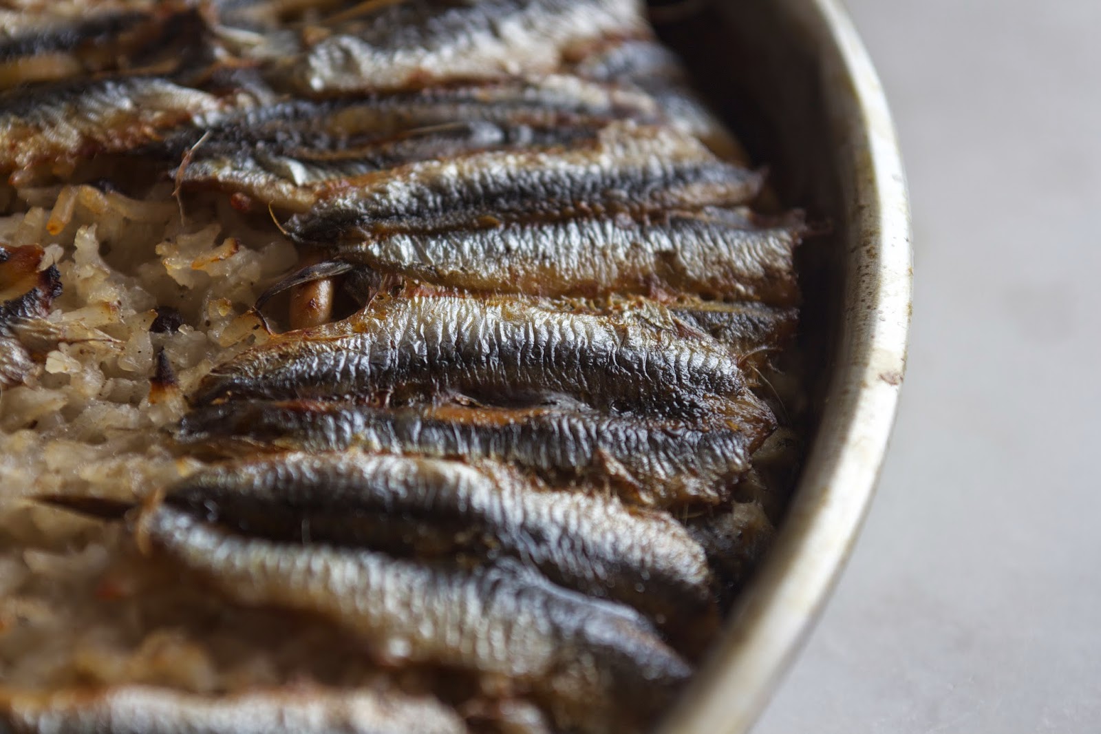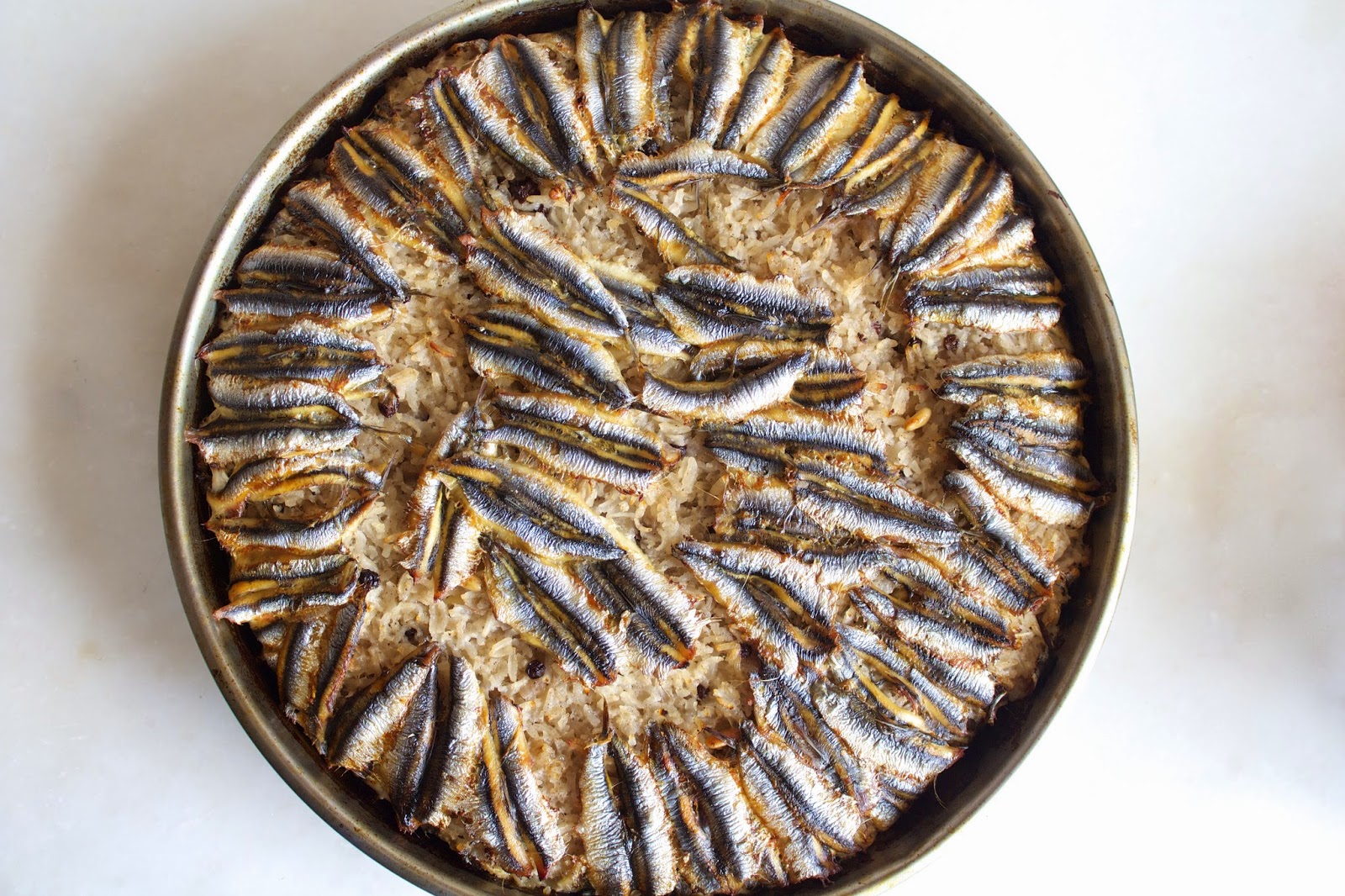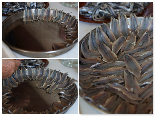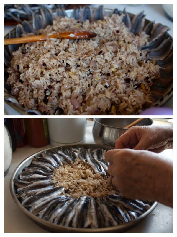 Pilav soğurken pişirme tepsisini yağlayın (Gülsüm Teyzenin kullandığı tepsi 30cm çapında idi). Hamsileri pullu tarafları tepsiye gelecek şekilde tepsinin kenarına dizmeye başlayın.