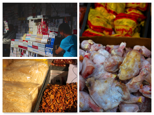 Biraz daha dolaşınca “pazar alanı”na ulaştık. İrili ufaklı standlarda satılan farklı markalarda sigaralar, mutfak araç gereçleri, ahşap materyaller, açıkta satılan tavuklar, daha akla gelmeyecek bir çok farklı malzeme. Çevredeki dükkanların vitrinlerinde Kurban Bayramını kutlayan yazılar da görmek mümkündü.