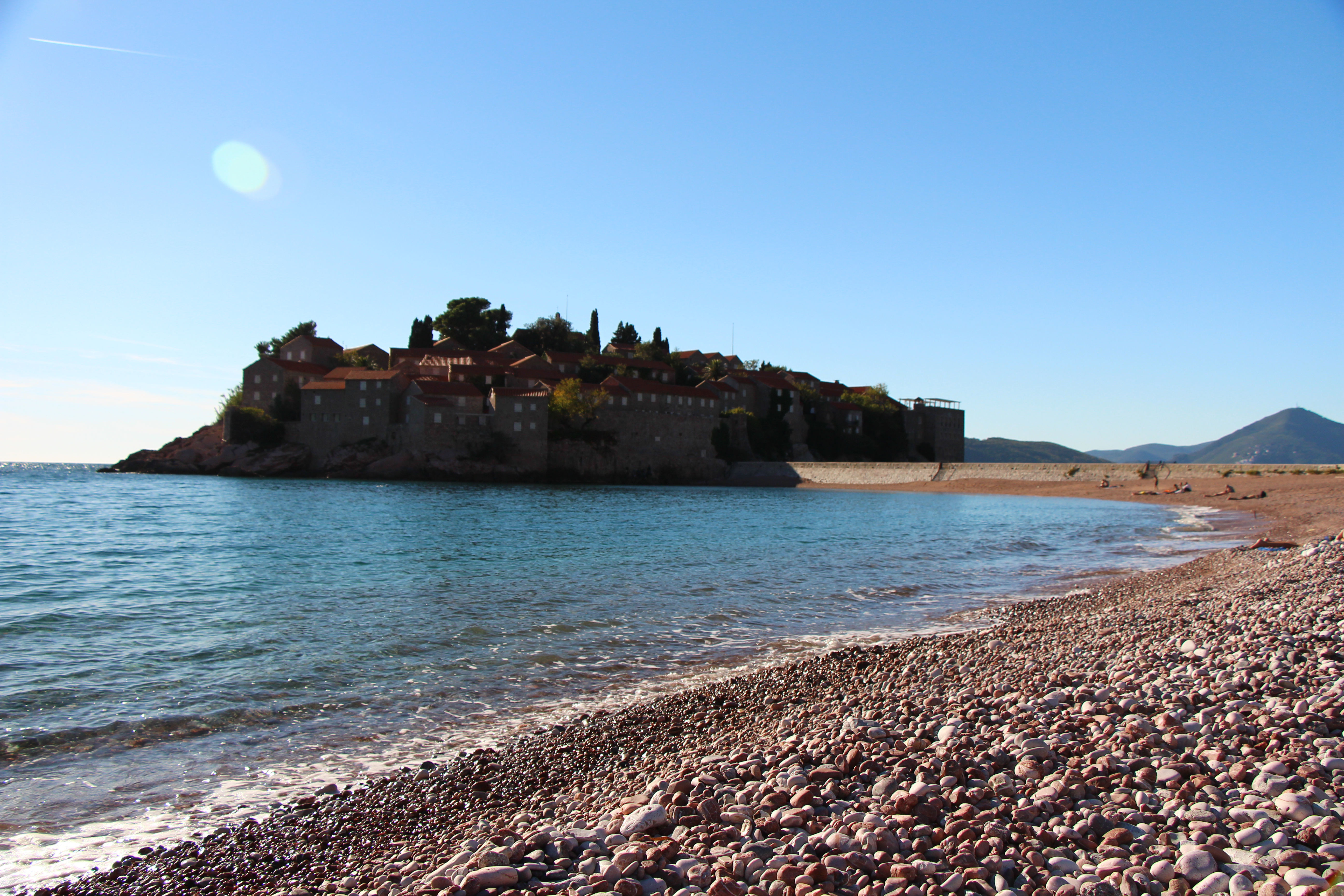 15. yy’dan kalma kırmızı çatılı, taştan evlerle kaplı adacığın anakaraya bağlantısı yaya yolundan ibaret, yerleşimin içinde kilise mevcut. son dönemde lüks bir resorta dönüştürülmüş. Sezon dışı olduğu için girişimiz kapıdaki görevli tarafından engelleniyor (sezonda giden arkadaşlarım, oradaki mekanlarda yemek yeme fırsatı bulmuşlar). Biz de biraz sahilde yürüyüp, sıcak havadan bunalınca kumsaldaki az sayıdaki turist gibi Adriyatik’in tadını çıkardık (sezondışı olduğu için wc-kabin gibi gerekli alanları kapatmışlardı).