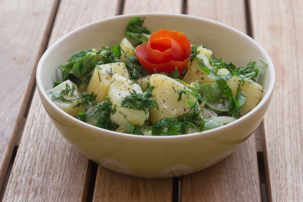 Viyana usulü patates salatasının özelliği hardallı, sirkeli sosu. Sosun püf noktası ise içine koyulan patates. Patates hem bütün tatları dengeliyor, hem de sosun kalınlaşmasını (yani koyulaşmasını) sağlayarak dokusunu güzelleştiriyor.
